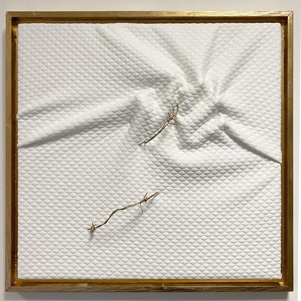 Een 3D ingelijst mixed media werk (55x55cm) van textiel en metaal in houten baklijst. Onderdeel van een tweeluik samen met ‘Feel no evil’ (zie hieronder)